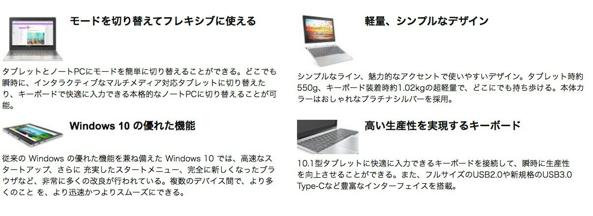タッチスクリーン 外出先でも文書編集できるOffice Mobile搭載 インテル Atom x5-Z8350 プロセッサー 1.44GHz 2GB 64GB (フラッシュメモリ) 10.1型ワイドIPSパネル WUXGA ブランドLenovo 商品重量1.02 Kg 梱包サイズ39.5 x 24.4 x 6.9 cm 電池:1 A 電池(付属) メーカー型番80XF002AJP カラープラチナシルバー 画面サイズ10 インチ 解像度1920x1200 ディスプレイ最大解像度1920×1200 CPUブランドIntel CPUタイプIntel Atom CPU速度1.44 GHz RAM容量2000 MB HDD容量64 GB ハードディスク種類eMMC ワイヤレスタイプ802.11 a/b/g/n/ac USB3.0用ポート数1 搭載光学ドライブ種類なし ハードウェアプラットフォームWindows OSWindows 10 電池の種類lithium_ion リチウム電池2 watt_hours リチウム電池パックbatteries_contained_in_equipment リチウム電池重量2 g リチウムイオン電池数1