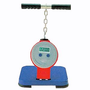 デジタル表示の背筋力計で測定値と最高値を表示します。