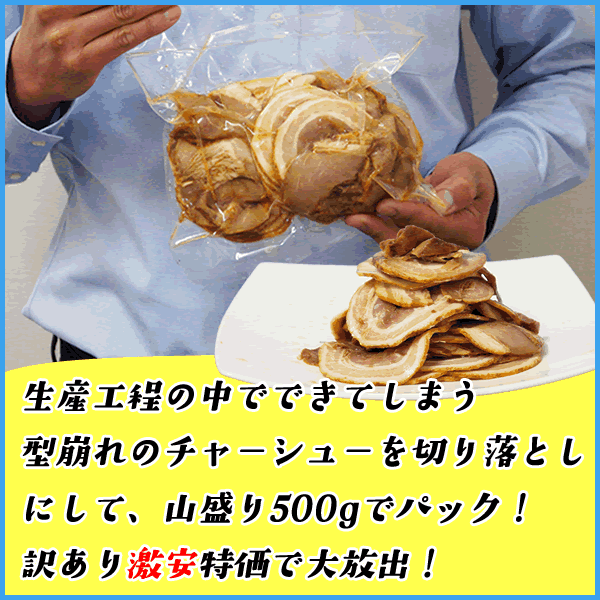 商品 お徳用バラチャーシュー(Y) 内容:500g 原材料:豚ばら肉、醤油、還元水あめ、上白糖、食塩、黒糖、みりん、粉末醤油、乳たん白、卵たん白、調味料(有機酸等)、 加工デンプン、カラメル色素、リン酸塩(Na)、カゼインNa、香料、香辛料抽出物、(原材料の一部に小麦を含む) 賞味期限:家庭用冷凍庫では1ヶ月を推奨しております。